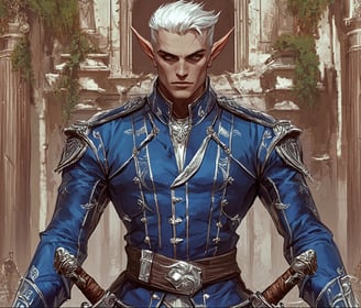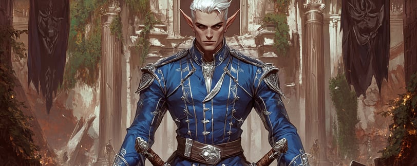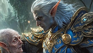 Under de tunge stenbuer, hvor elvernes banner engang vajede stolt, stod Frej Spidsklinge, overhovedet for den royale livgarde, med armene over kors. Hans øjne skar som knive mod de tre skikkelser, der nærmede sig porten. Foran gik Eldar, den ældre elver, som syntes at være en fange i sine egne omgivelser, hans hænder bundet på ryggen, hans blik en blanding af arrogance og irritation. Bag ham marcherede Ayoa og Aramil, iført de stjålne uniformer fra de faldne guldhamre.