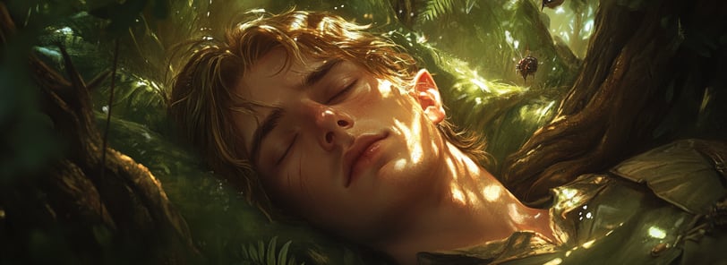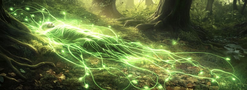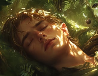 Jorden under hende skælvede svagt, og grønne, lysende ranker af energi bredte sig som levende åndedrag henover græsset. De snoede sig mellem nedtrampede planter, dansede som refleksioner iblandt træernes skygger, før de nåede Eldars krop. De lysende ranker bøjede sig op omkring Eldar, og formede sig til bløde løvblade og indhyllede ham i en glødende, livgivende kokon. Det så ud, som om skovens ånd selv havde besluttet at holde fast i ham, at nægte ham døden.
