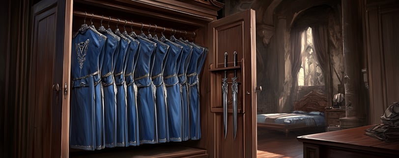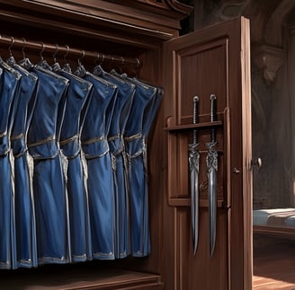 Inde i rummet var alting minutiøst ordnet, en skarp kontrast til paladsets øvrige forfald. Skrivebordet var næsten tomt, sengen upåklageligt redt. Eldar gik uden tøven til garderobeskabet, hvor en række identiske uniformer hang – hver eneste en eksakt kopi af den, Frej Spidsklinge selv bar. På indersiden af skabslågen var to dolke monteret i et skjult våbenstativ, klinger skinnende og perfekt vedligeholdt. Han strøg en hånd over stoffet på den bedst bevarede uniform, målte dens snit med erfarne øjne.