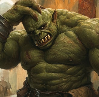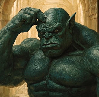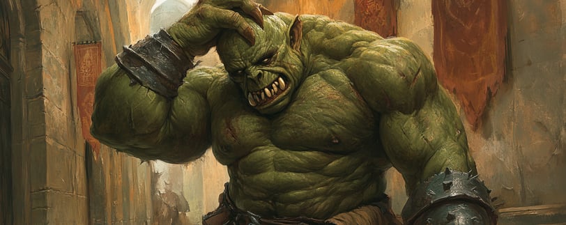 På vej mod tronsalen rungede tunge fodtrin gennem paladsets korridorer, og pludseligt bragede en massiv skikkelse gennem en dør ved trappen. En enorm, grøn skabning – bred som en kampvogn og høj nok til næsten at skrabe loftet – trådte frem med en tung, slæbende gang.