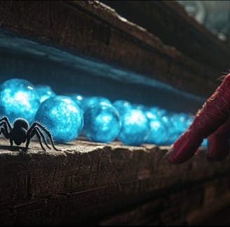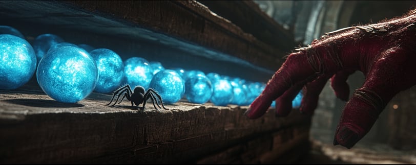 Med en snigende uro over, hvad der ventede bag dørene, lod Ayoa sin krop skifte form, og på få øjeblikke blev hun til en lille, sort edderkop, der elegant gled ind under dørsprækken.