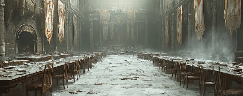 Gulvene var dækket af støv og gamle fodspor, væggene bar mærker af fugt og forfald. I den store spisesal stod bordene dækket, som om en banket var blevet forladt midt i et måltid – maden for længst rådnet væk og overtaget af sværme af rotter. I køkkenet hang kedler med fastbrændte rester, bunkerne af beskidte tallerkener vidnede om en tid, hvor nogen havde forsøgt at opretholde illusionen af normalitet.