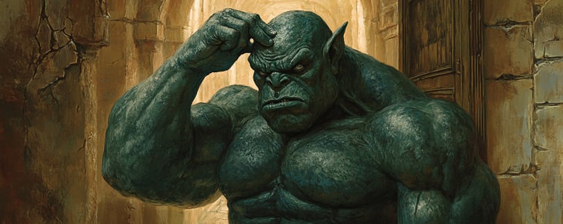 “Jan ikke skulle gå ned… men Jan gjorde det alligevel,” brummede kæmpen, idet han kløede sig i nakken med en hånd stor nok til at knuse et kranie. “Men Kharak siger, Jan skal ikke tænke for meget… så Jan tænker ikke.”