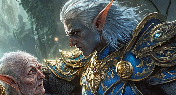 "Ét skridt nærmere, og det bliver din vens død!" råbte Eldar med skælvende autoritet, mens dolkens klinge blinkede mod det eneste gode øje, hans gidsel havde tilbage. Ordene gav genlyd i den stille have, men Guldhammeren standsede ikke. Hans blik var hårdt som stål, og hans skridt fortsatte uanfægtet, som var Eldars trussel blot en mild brise mod hans beslutsomhed.